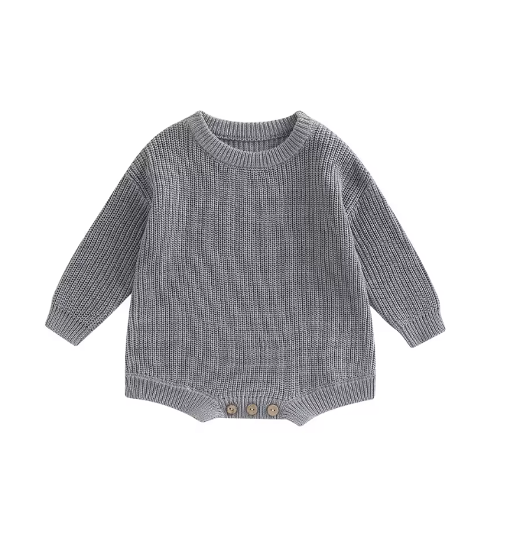 Romper tejido de manga larga en tono gris, suave y acogedor. Su diseño clásico y minimalista lo convierte en una prenda ideal para cualquier ocasión, combinando comodidad y estilo atemporal.