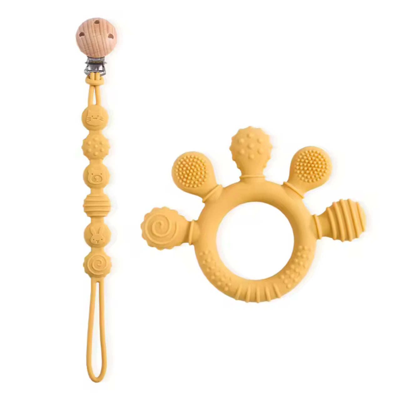 Práctica, segura y multifuncional. Esta mordedera de silicona de alta calidad ayuda a aliviar las molestias en las encías, mientras que el portachupón con clip de acero inoxidable mantiene tanto el chupón como la mordedera siempre al alcance. Fácil de sujetar y firme en cualquier prenda. ¡Un accesorio ideal para acompañar a tu bebé con estilo y seguridad!