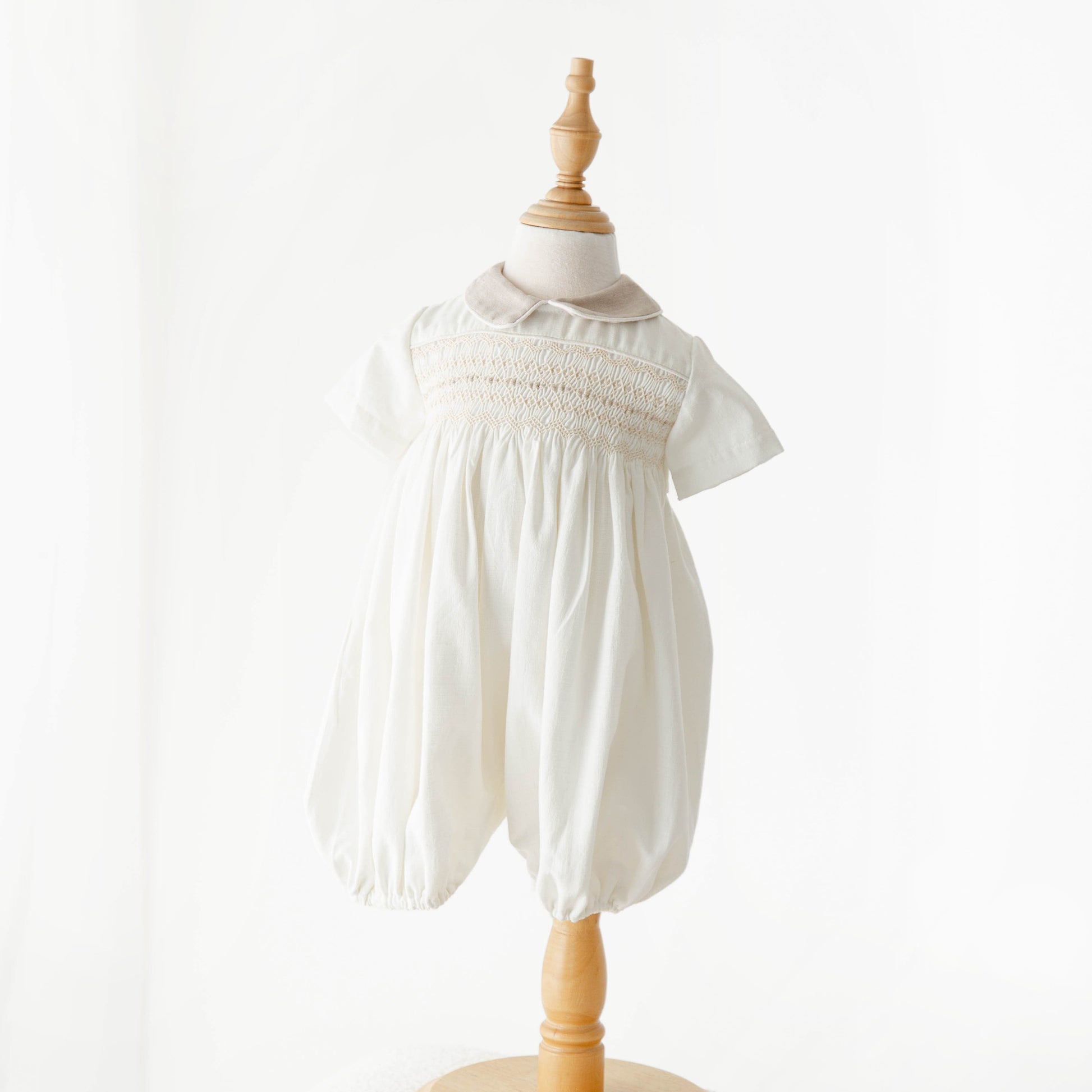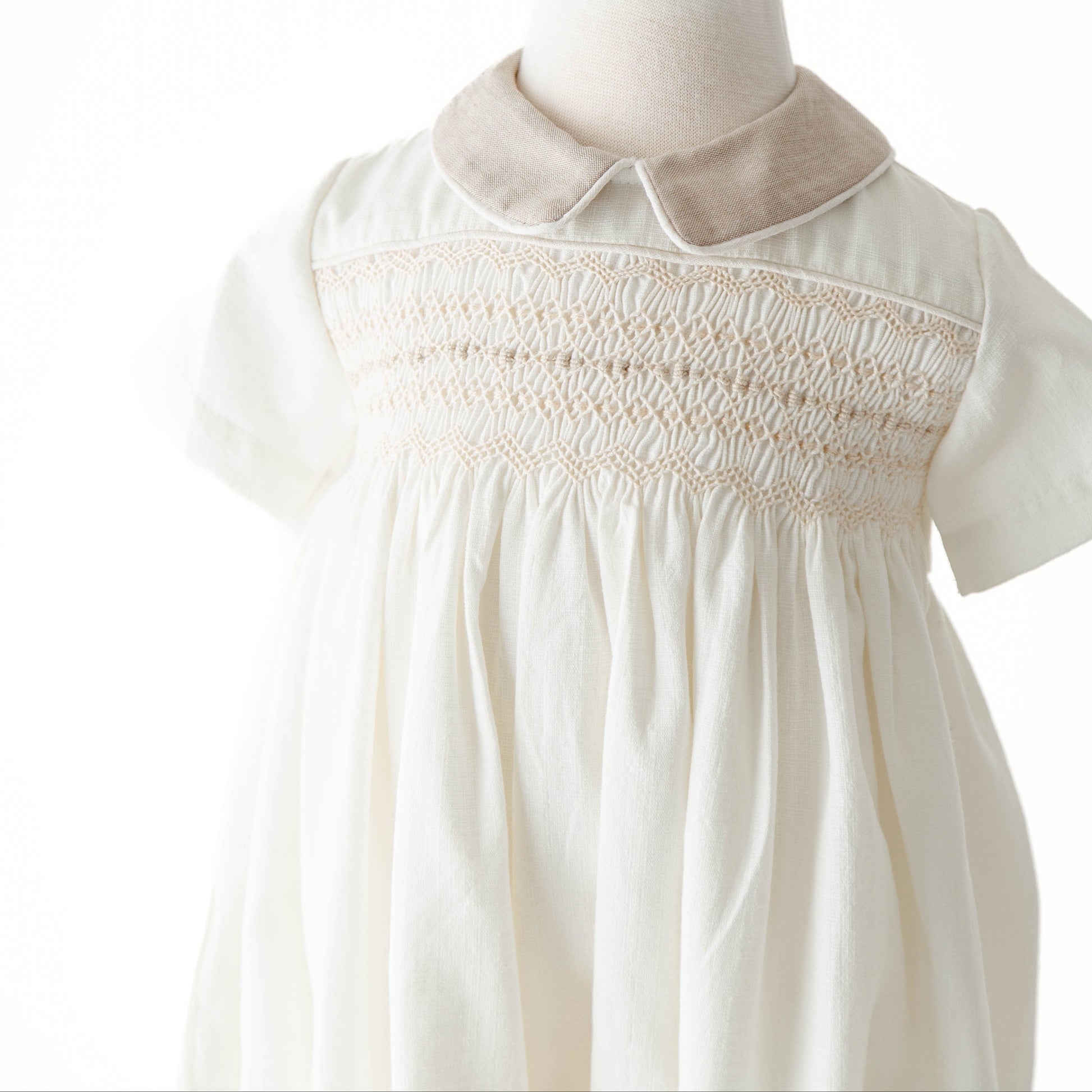 Un diseño clásico en tono marfil con delicado smock bordado a mano. Su cuello Peter Pan y silueta abombada crean un look elegante y atemporal, ideal para ocasiones especiales.