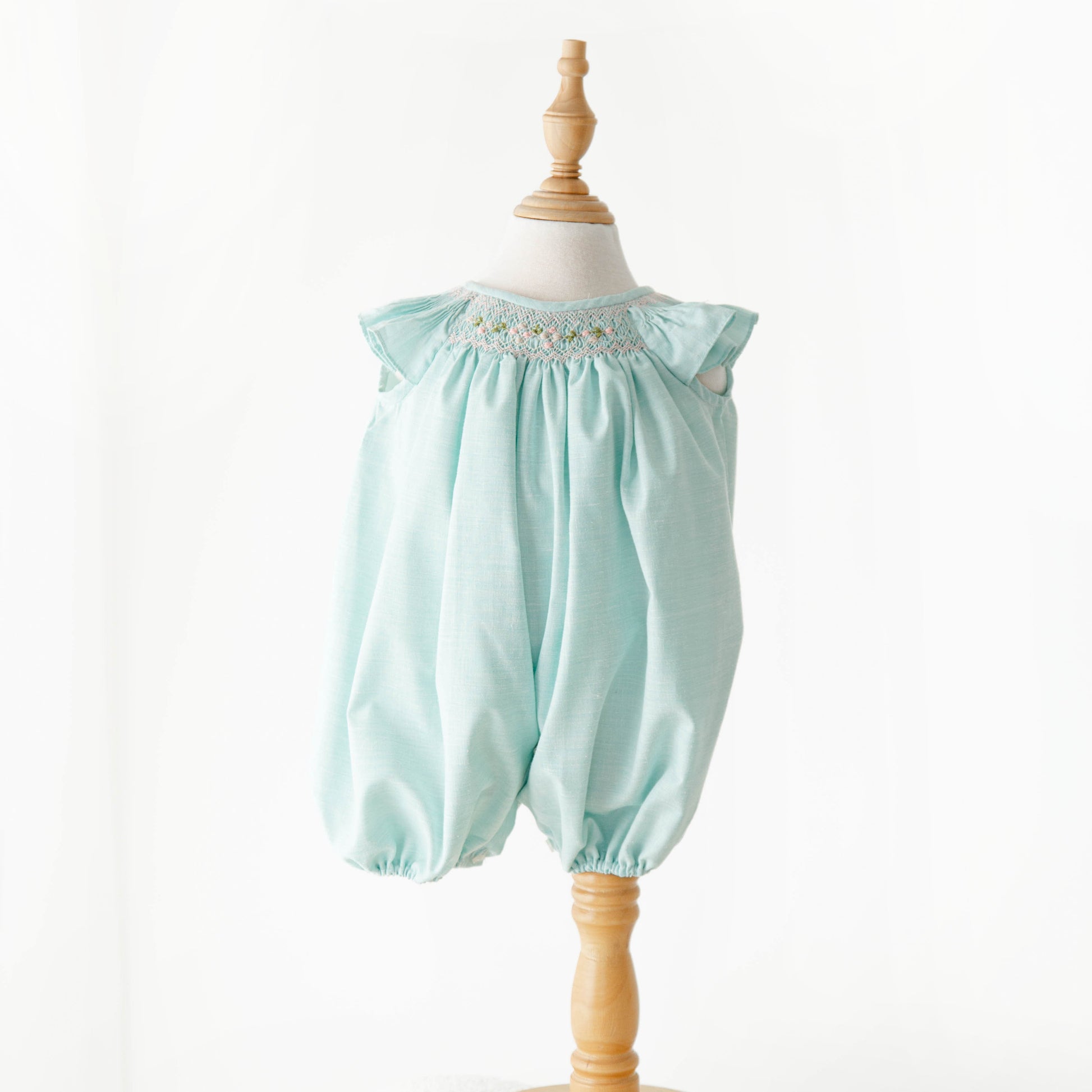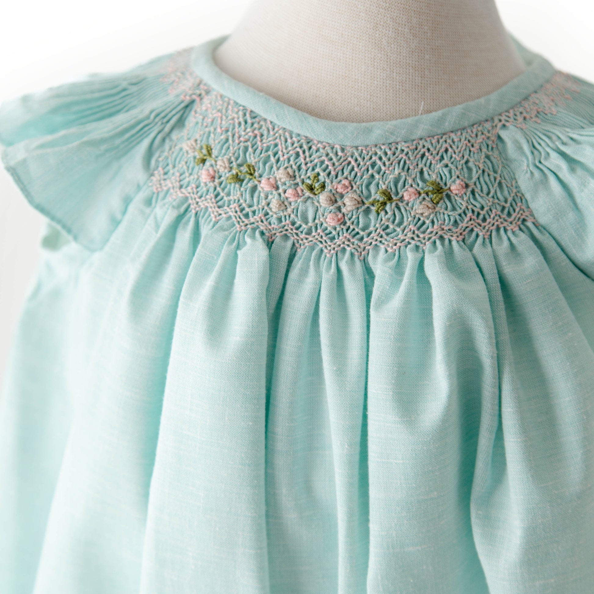 Un diseño delicado en tono aqua con smock bordado a mano en suaves tonos pastel. Su silueta ligera y hombros con sutil vuelo crean un look dulce, elegante y atemporal, perfecto para ocasiones especiales.