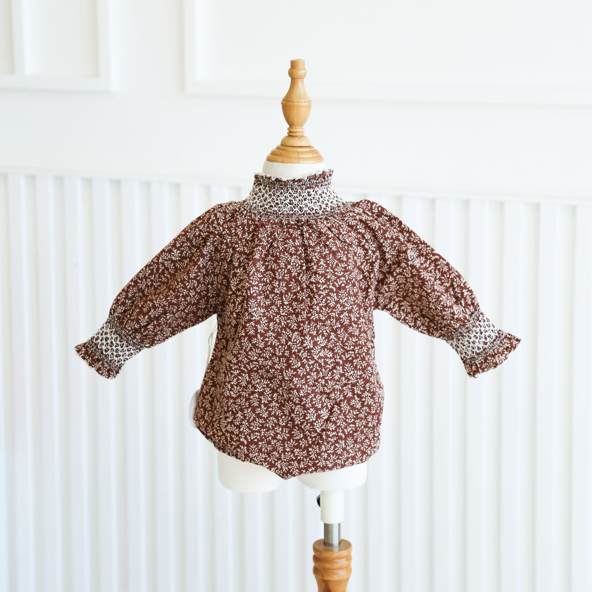 Delicado romper de manga larga con cuello en punto smock y puños con detalle a juego. Estampado floral sutil que aporta un toque elegante y encantador.