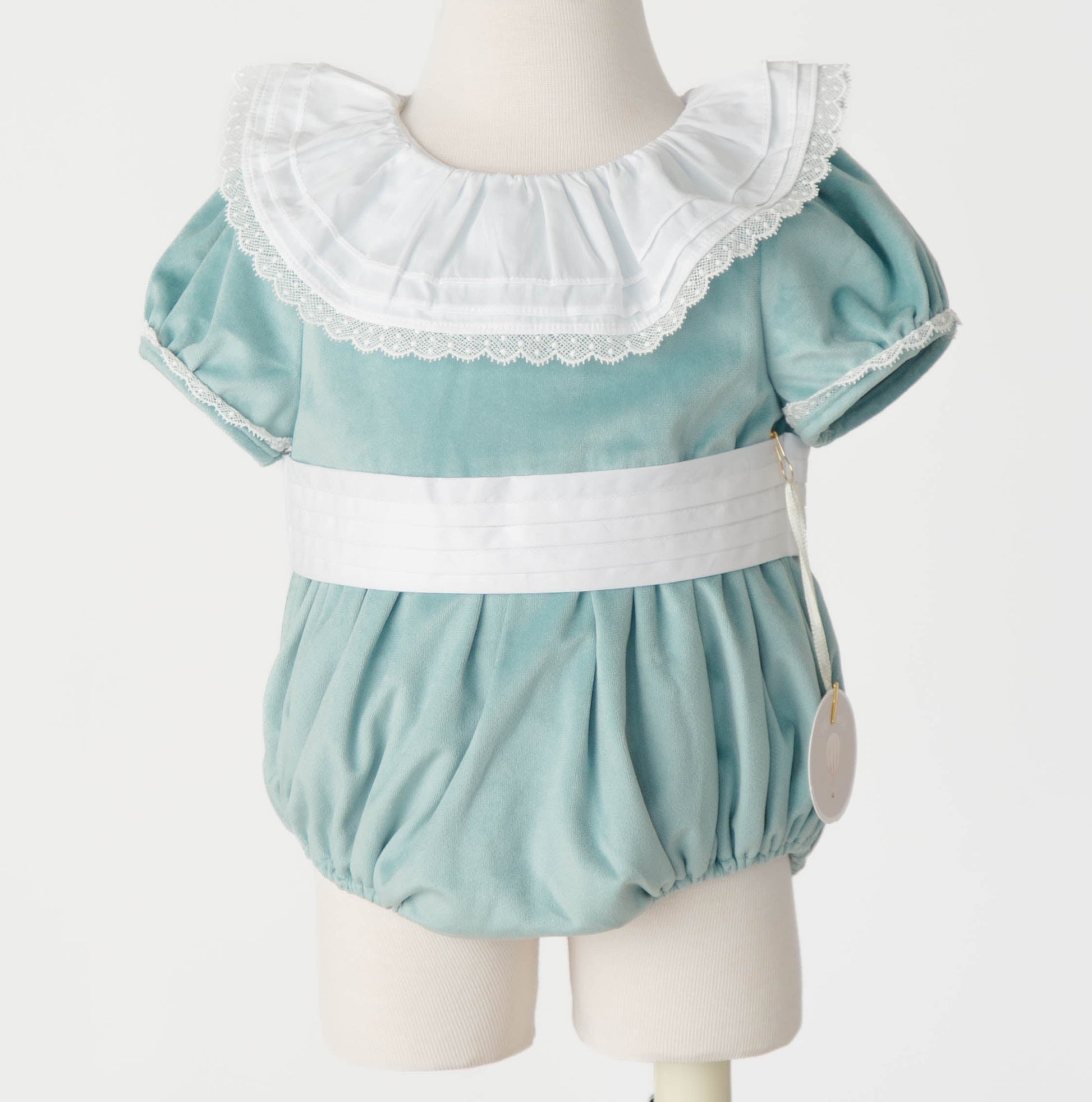 Romper color verde agua con cuello blanco y delicado encaje. Diseño clásico y cómodo, ideal para ocasiones especiales o looks elegantes.