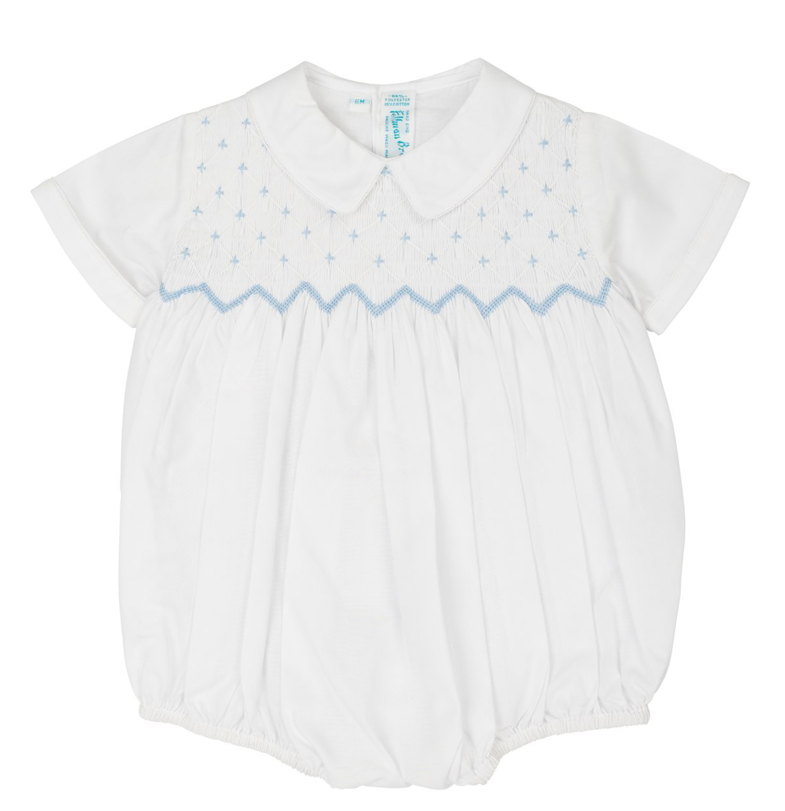 Nuestro Diamond Smocked Creeper combina un estilo delicado y atemporal, con bordado en forma de diamante y detalles de encaje en cuello y puños. Disponible en blanco suave y azul bebé, es perfecto para reuniones familiares o cualquier ocasión especial.