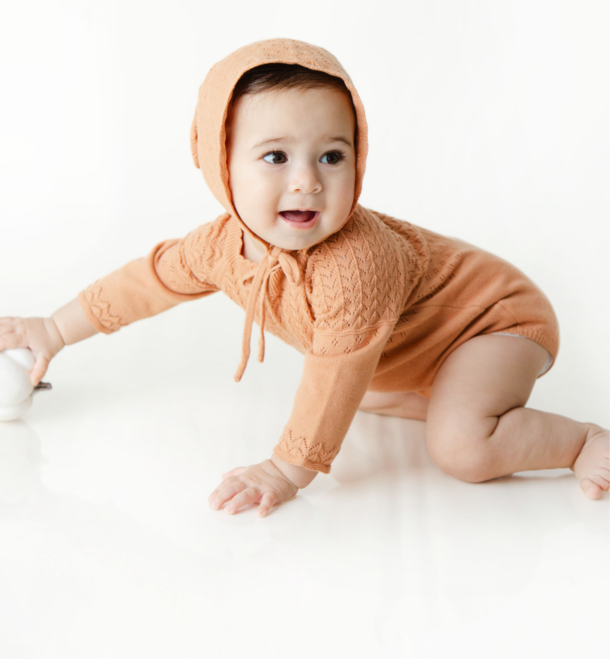 Set Amber: incluye romper y gorrito tejidos a mano en hilo suave y respirable.