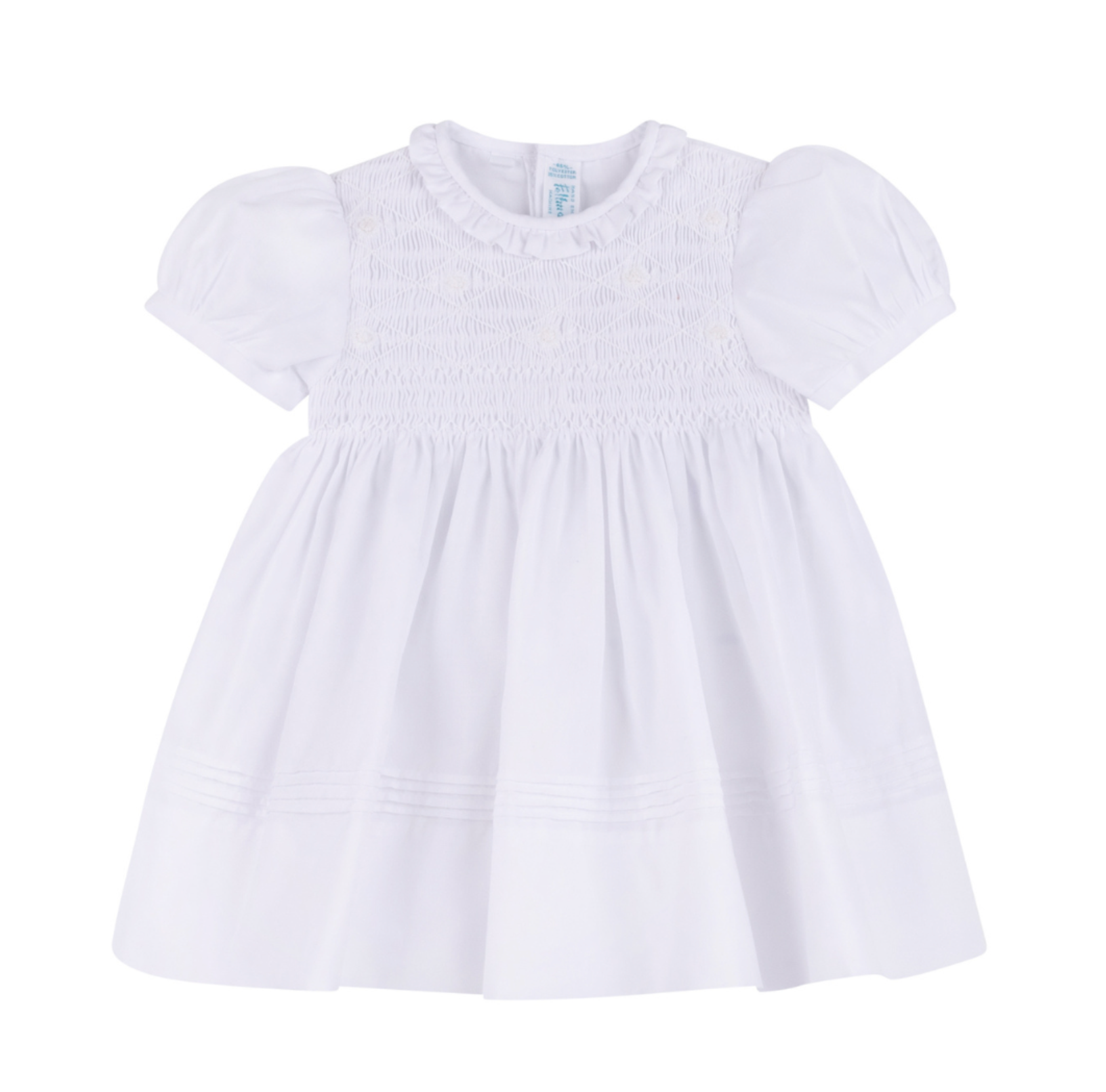 Perfecto para celebraciones, ocasiones especiales o como vestido de dama de flores. Presenta un delicado bordado floral en el pecho con punto smock y cuello con volantes.