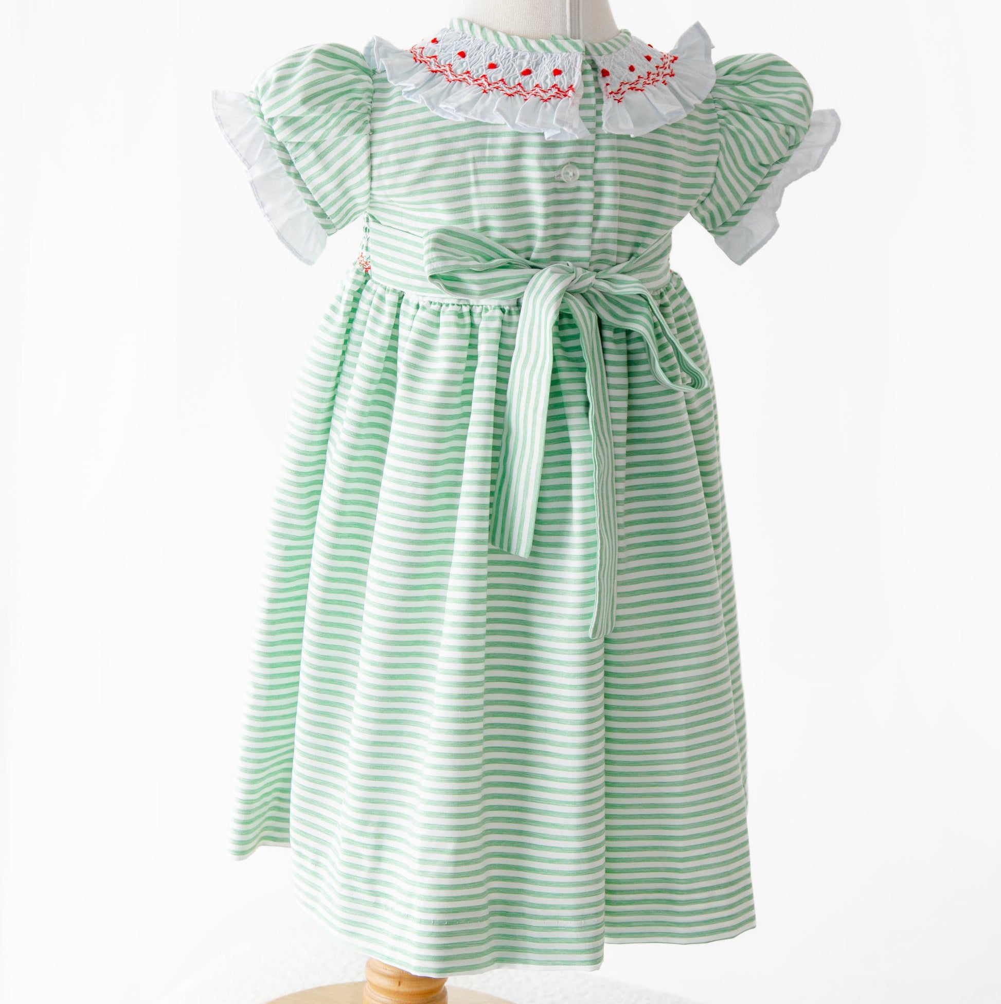 Un diseño vibrante en tonos verde y rojo que evoca la frescura de la primavera. Con delicado cuello bordado en smock y botones al frente, su silueta clásica se realza con detalles artesanales que aportan un aire elegante y lleno de vida. Perfecto para momentos especiales con un toque de color.